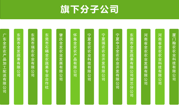 廣東全農(nóng)農(nóng)業(yè)(集團)有限公司創(chuàng)建于 1989 年,深耕農(nóng)業(yè) 30余載,是一家專注于農(nóng)產(chǎn)品產(chǎn)業(yè)鏈建設(shè)及運營的專業(yè)蔬菜集團公司,被認(rèn)定為東莞市優(yōu)秀農(nóng)業(yè)龍頭企業(yè),廣東省重點農(nóng)業(yè)龍頭企業(yè)。現(xiàn)有寧夏全農(nóng)、寧夏瑞農(nóng)、河南全農(nóng)、廈門翰農(nóng)等下屬公司十三家,公司實力雄厚,資源豐富,產(chǎn)品銷售網(wǎng)絡(luò)遍及華南、直通港澳、遠(yuǎn)銷海外;現(xiàn)已形成以蔬菜種植、加工、冷鏈、物流及配送為核心的產(chǎn)業(yè)集群和銷售網(wǎng)絡(luò)。